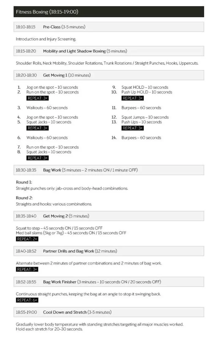 Each session starts with a warm-up, including stretching and light calisthenics. Then he moves on to some form of circuit targeting the whole body. Afterwards, everyone is paired up, with gloves and pads. There is no body contact, only contact between gloves and pads. He tries to match people who are at similar fitness and experience levels so they can work comfortably with each other. In these pairings, members do partner-based boxing drills, including combinations of straight punches, hooks, and upper cuts. The environment of class is always casual and relaxed, allowing members to work at their own pace within a structured framework. He encourages everybody to push as hard or little as they want to, and he accommodates to meet the intensity level of the particular group. He also offers modified instructions for people with injuries and restrictions.