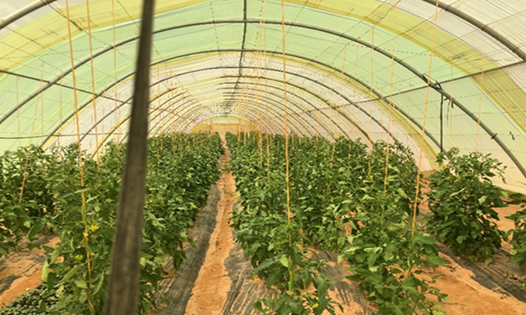 There are 2 growing seasons, the first is planted in September and harvested in February/March. They have grown tomatoes, cucumbers and sweet peppers inside the polytunnel, and onions, carrots, courgettes turnips, aubergines, spinach, lettuce, celery tops, parsley, coriander, and mint. The second season of melons and watermelons is planted in February and harvested in May.